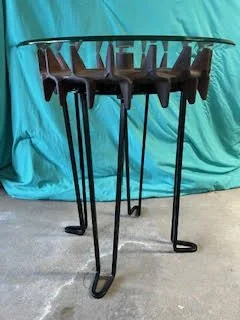 Clark PflanzSide TableSalvaged Steel Powder Coated and Topped with a Larger Farming Gear and Glass Top29” x 24” $600